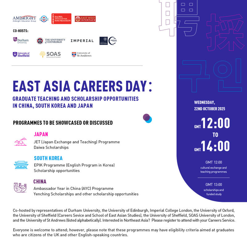 The East Asia Careers Day 2025 will take place on Wednesday 22 October, 12-2pm, and will cover: